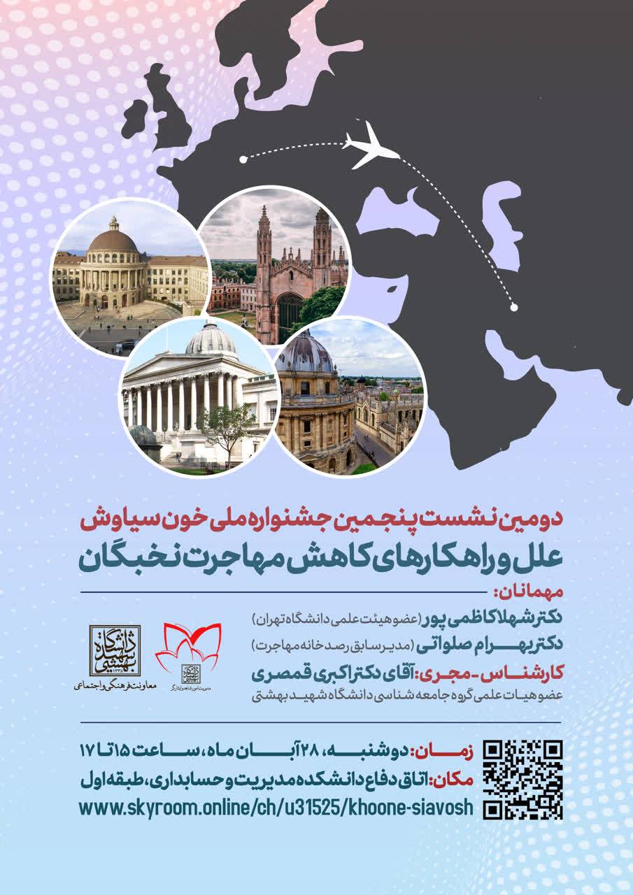 دومین نشست از سلسله نشستهای پنجمین جشنواره خون سیاوش با موضوع مهاجرت؛ «بازگشت»، در روز دوشنبه مورخ 28 آبان ماه با حضور اساتید و کارشناسان، با موضوع مهاجرت نخبگان، علل و راهکارهای کاهش آن، به صورت حضوری و برخط برگزار شد. در این نشست ضمن پرداختن به وضعیت کنونی مهاجرت نخبگان، علل این مسأله و راهکارهای مدیریت آن بیان شد.