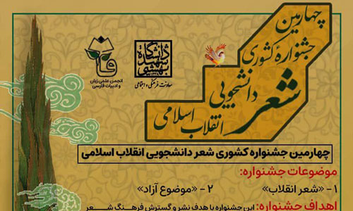 صفحه اصلی چهارمین جشنواره شعر کشوری دانشجویی انقلاب اسلامی 52023 بازدید print share چهارمین جشنواره کشوری شعر دانشجویی انقلاب اسلامی با دو موضوع «شعر انقلاب» و «موضوع آزاد»، 18 بهمنماه برگزار...