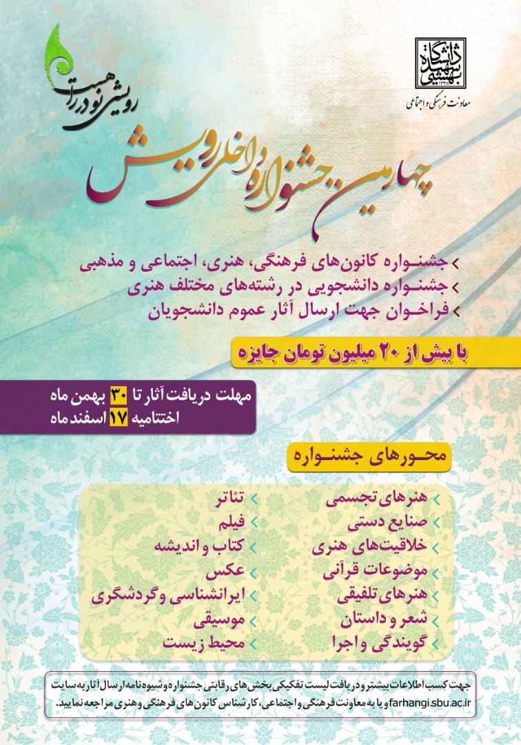 جشنواره داخلی رویش با هدف ایجاد نشاط و همبستگی جامعه دانشگاهی توسط معاونت فرهنگی و اجتماعی دانشگاه شهید بهشتی برگزار و آثار برگزیده برای شرکت در جشنواره ملی رویش ارسال خواهند شد.